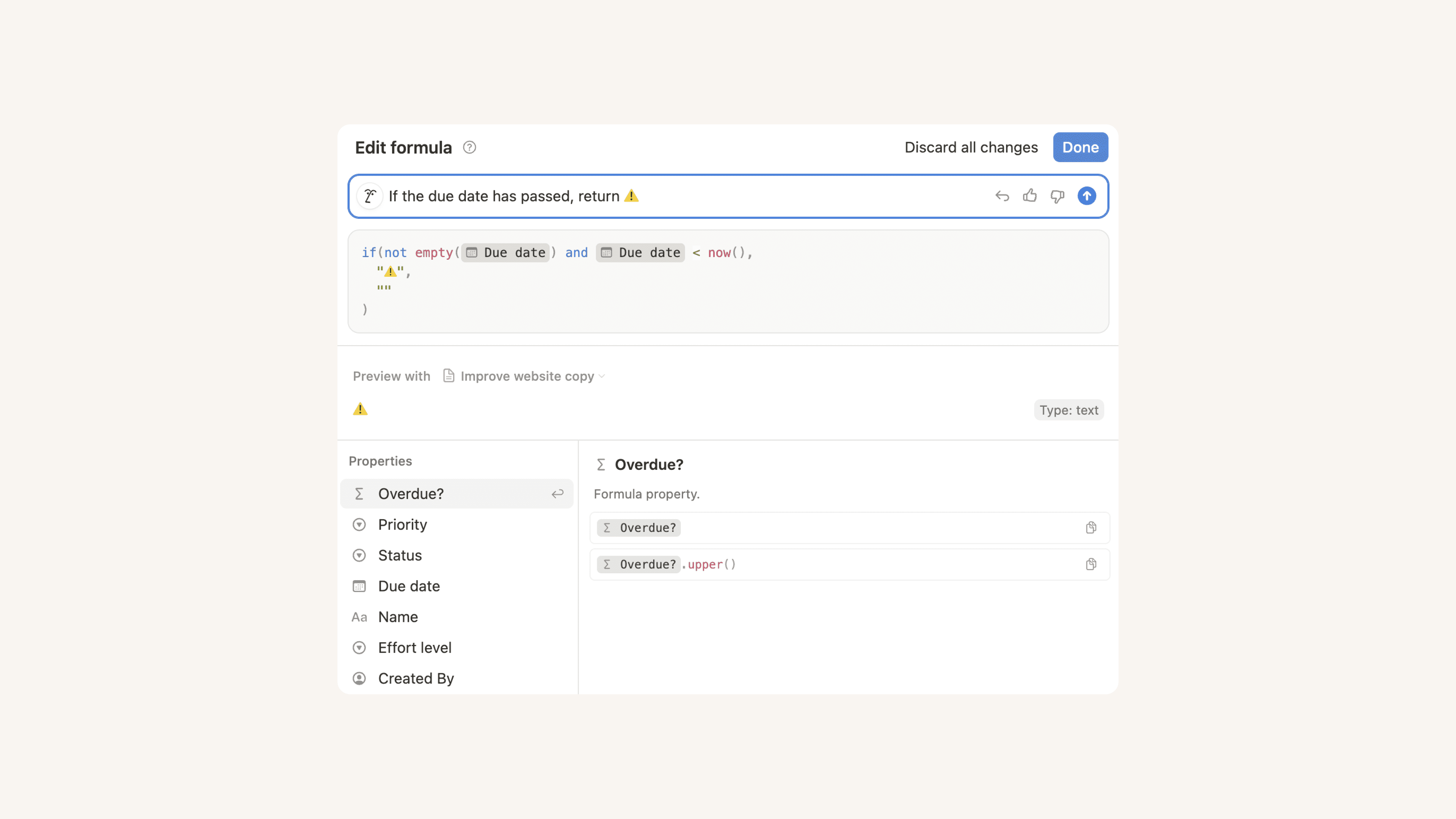 "이 수식이 예외 케이스를 처리하도록 하세요." (예를 들어, 필드가 비어 있어도 수식이 실패하지 않도록 Notion AI가 if 문을 추가할 수 있습니다.)